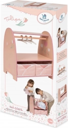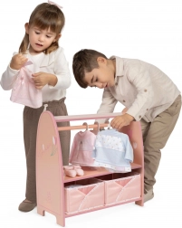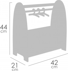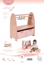 Zapewnij dzieciom porządek w świecie lalek. Ten kompaktowy drewniany stojak z kolekcji TULIPE oferuje praktyczne rozwiązanie do wieszania i przechowywania ubranek oraz akcesoriów. Drążek z 3 drewnianymi wieszakami pomieści ubranka o długości ok. 19 cm, dolna półka i 2 składane materiałowe koszyki utrzymają resztę w zasięgu ręki.