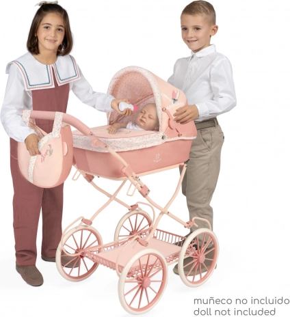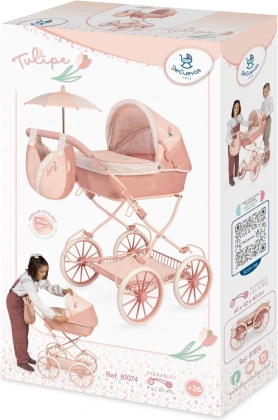 W zestawie znajduje się stylowa torba w kształcie tulipana, składany parasol przeciwsłoneczny oraz miękki materacyk dla lalki. Do tego kieszeń na budce, pokrowiec gondoli na napy oraz pojemny koszyk pod wózkiem. Duże koła szprychowe i resory zapewniają płynne kołysanie i stabilną jazdę.