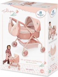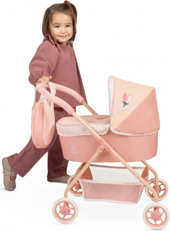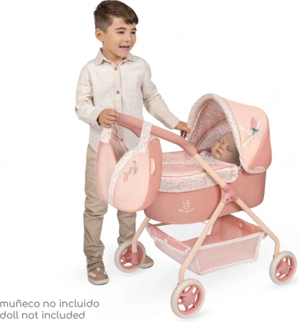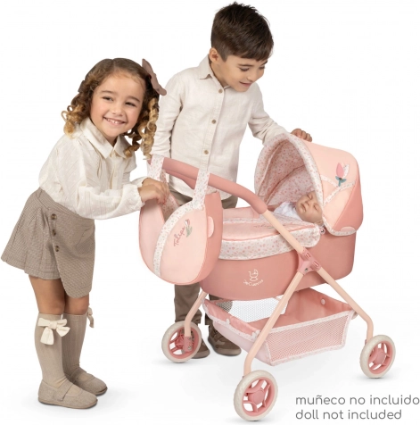 Uroczy wózek dla lalek z kolekcji Tulipe łączy piękny hiszpański design z praktycznością do codziennej zabawy. Delikatne łososiowe pastelowe kolory z kwiatowym wzorem oraz tematyczna torebka w kształcie tulipana sprawiają, że to doskonały prezent dla dzieci od 3 lat.