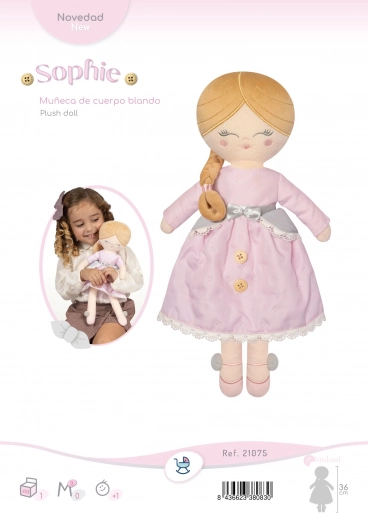 Przedstawiamy uroczą pluszową lalkę Sophie o wysokości 36 cm z nowej kolekcji 2025. Wykonana z wysokiej jakości, błyszczącego pluszu, jest miękka, lekka i idealna do przytulania oraz w podróży. Lalka jest przeznaczona do prania ręcznego w 30 °C i zachwyca delikatnym hiszpańskim designem w odcieniach jasnego różu z szarymi i białymi detalami.