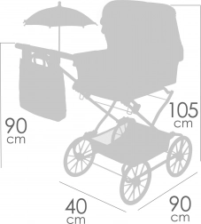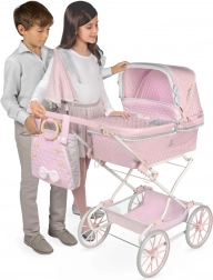 Bogate wyposażenie obejmuje składany parasol, ozdobną odpinaną torebkę, osłonę gondoli na napy z kieszonkami, miękki materac i kocyk z delikatnym futerkiem. Praktyczny dolny kosz oferuje miejsce na akcesoria. Solidna metalowa konstrukcja w połączeniu z tkaniną i tworzywem zapewnia trwałość i łatwą pielęgnację. Model jest kompaktowy po złożeniu i nadaje się do zabawy w domu oraz na dworze.
