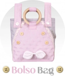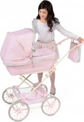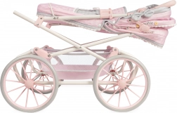 Jasnoróżowe wykończenie, ozdobne kokardki i koronki. W zestawie parasol, torebka, osłona gondoli, materac i miękki kocyk.