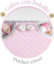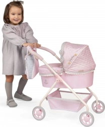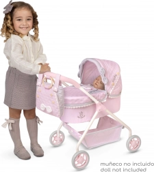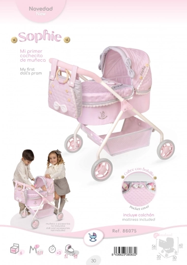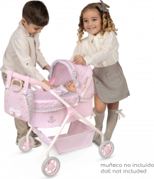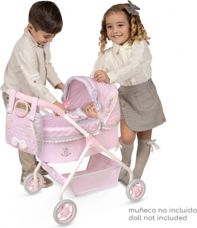 Praktyczne wyposażenie obejmuje odpinaną torbę na wózek lub do ręki, pokrowiec gondoli z oczkami i kieszonkami, wygodny materacyk oraz dolną przestrzeń do przechowywania na drobiazgi. Hiszpański design i precyzyjne wykonanie zapewniają długą trwałość i radość z zabawy każdego dnia.