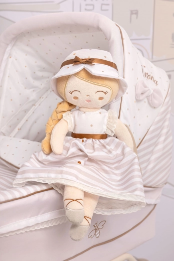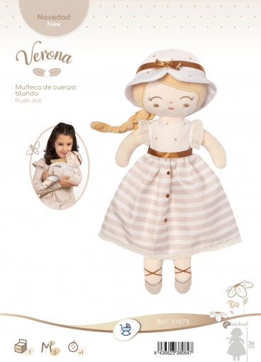Pluszowa lalka Verona 36 cm to mała przyjaciółka inspirowana naturalnymi tonami i subtelnymi wzorami, które zachwycają ponadczasowym wyglądem. Połączenie jasnego beżu i bieli w kropki lub paski, uzupełnione delikatną lamówką, podkreśla elegancki hiszpański design. Lalka wykonana jest z wysokiej jakości gładkiego, lekko połyskującego pluszu, który jest przyjemny w dotyku i odpowiedni do codziennej zabawy.