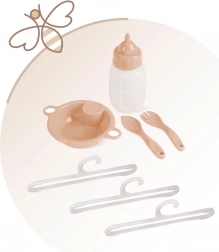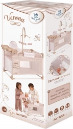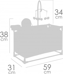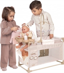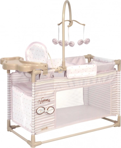 W zestawie znajduje się wszystko, czego potrzebują małe mamusie: karuzela do zabawy dla lalki, przewijak do pielęgnacji, krzesełko do karmienia z butelką, miseczką i sztućcami oraz praktyczna szafka na zamek z wieszakami. Część łóżeczkowa z okienkiem z siateczki pozwala mieć lalkę cały czas na oku, a obszerna podstawa zapewnia wygodę podczas zabawy.