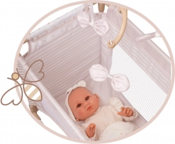Ta elegancka kołyska dla lalek w pastelowych odcieniach beżu i bieli stylowo dopełni każdy dziecięcy pokoik. Łączy naturalny wygląd z uroczymi detalami, takimi jak kropki, paseczki i subtelne kokardki przypominające płatki kwiatów. Dzięki wysokiej jakości wykonania i stabilnej konstrukcji zabawa jest bezpieczna i komfortowa.