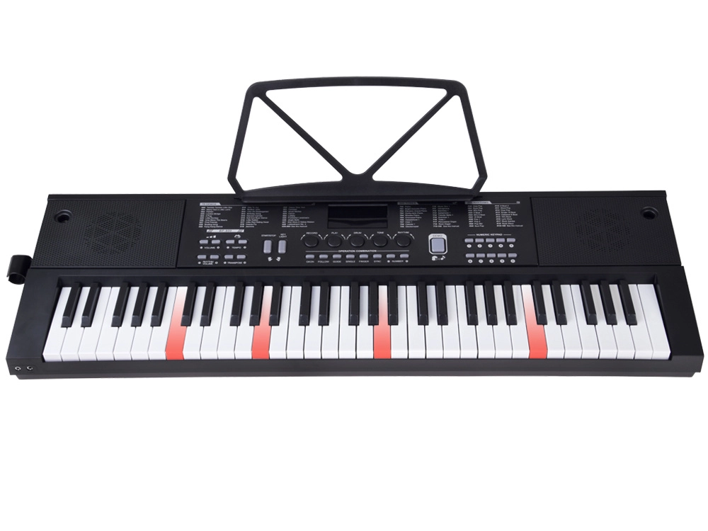 Ten 61‑klawiszowy elektroniczny keyboard łączy bogate wyposażenie z intuicyjną obsługą. Podświetlane klawisze prowadzą Twoją grę krok po kroku, a przejrzysty wyświetlacz LCD przyspiesza wybór brzmień, rytmów i funkcji. Powierzchnia klawiszy z imitacją drewna uprzyjemnia dotyk i sprzyja komfortowemu graniu.