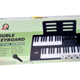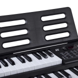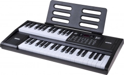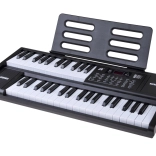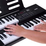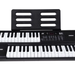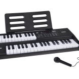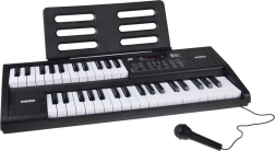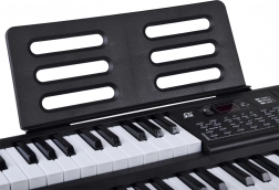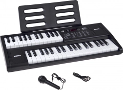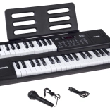 W zestawie znajduje się mikrofon i pulpit na nuty. Klawisze są kompaktowe, z wbudowanymi głośnikami i prostą obsługą – idealne do muzykowania w domu, ćwiczenia akompaniamentu i pierwszych własnych kompozycji.