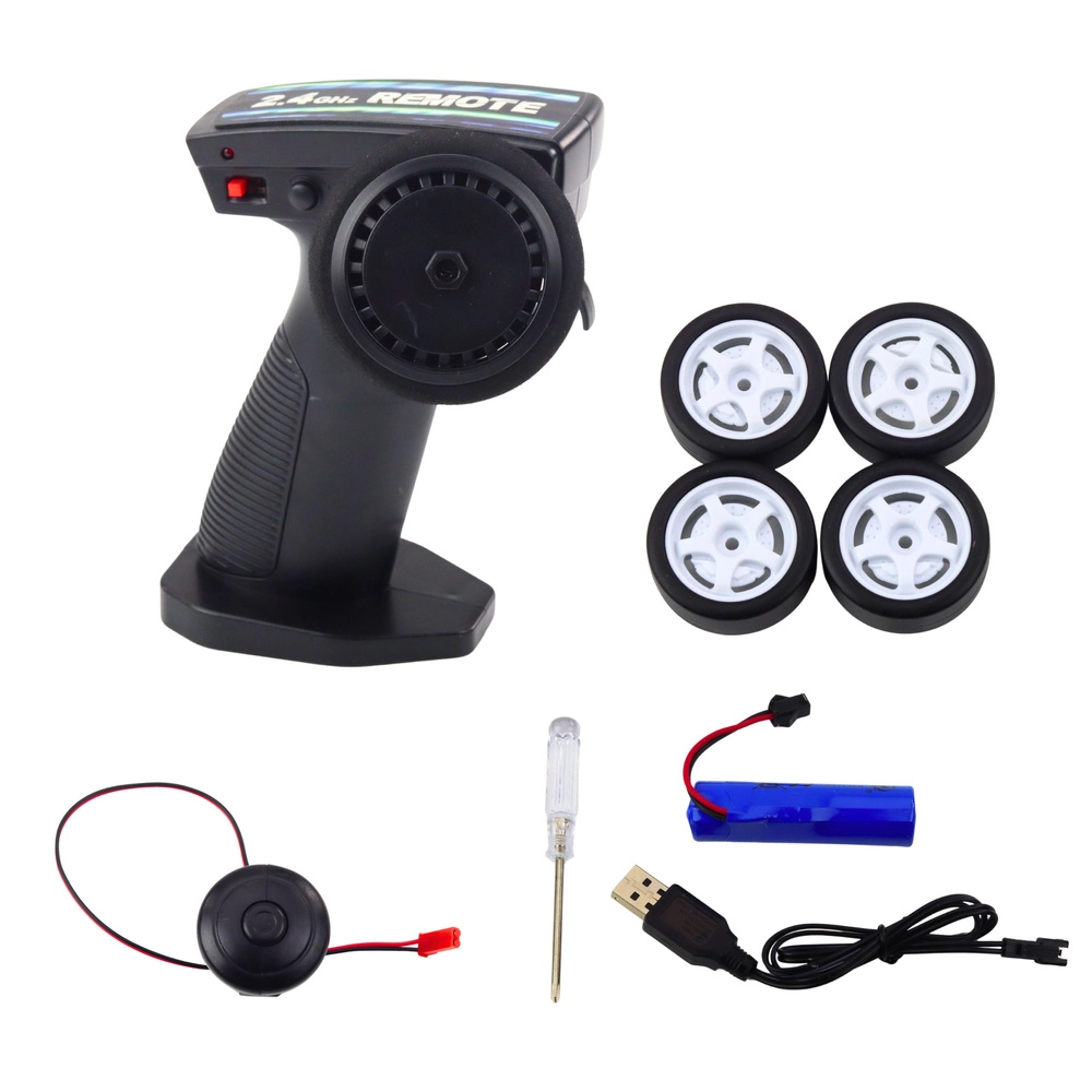 - Samochód RC, akumulator 7.4V Li, kabel do ładowania USB, zestaw kół do driftu, pilot 2.4G, śrubokręt