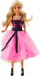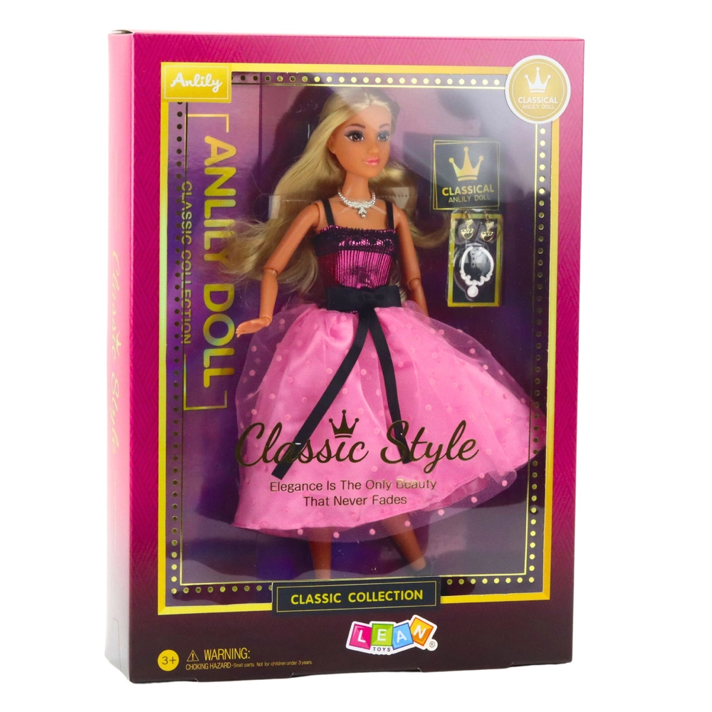 lalka ANLILY w różowo‑czarnej sukni, biały naszyjnik, kolczyki, czarne buty