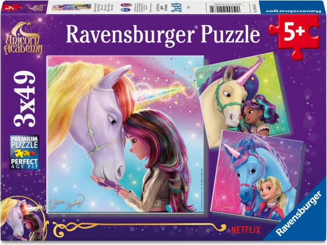 Zestaw trzech dziecięcych puzzli po 49 elementów z motywami ulubionej bajki UNICORN ACADEMY (Akademia jednorożców) od marki RAVENSBURGER. Wysoka jakość z antyrefleksyjną, lnianą strukturą, wytrzymałymi elementami oraz technologią SoftClick dla precyzyjnego dopasowania. Idealne dla dzieci od 5 lat – rozwijają uwagę, pamięć i motorykę małą.