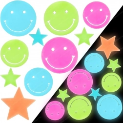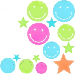 Wesoły zestaw fluorescencyjnych naklejek rozświetli pokój dziecięcy i wprowadzi baśniową atmosferę. Po naświetleniu zachwycają delikatnym świeceniem w ciemności, kolorowe uśmiechy i gwiazdki występują w różnych rozmiarach. Dzięki samoprzylepnym piankowym elementom niezawodnie trzymają się ścian, sufitu i mebli, a także można je łatwo usunąć bez śladów. Wykonane z bezpiecznych, nietoksycznych materiałów spełniających normy europejskie.