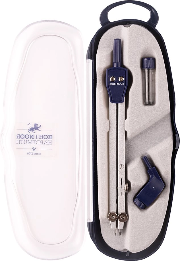 Praktyczny szkolny cyrkiel marki KOH-I-NOOR do precyzyjnego rysowania okręgów o średnicy do 360 mm. W zestawie znajduje się uniwersalna nasadka (adapter), ołówek automatyczny z 2 zapasowymi grafitami oraz wytrzymałe plastikowe etui do bezpiecznego przechowywania.