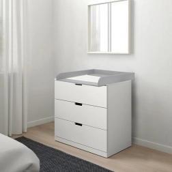 Praktyczna drewniana nakładka na przewijak w eleganckim szarym kolorze zapewniająca bezpieczne i wygodne przewijanie. Oferuje łatwy montaż i demontaż, przesuwaną przednią listwę do 4 cm oraz kompatybilność z komodami IKEA (Nordli, Malm, Hemnes). Idealne rozwiązanie do oszczędności miejsca i przemyślanej organizacji w pokoju dziecięcym.