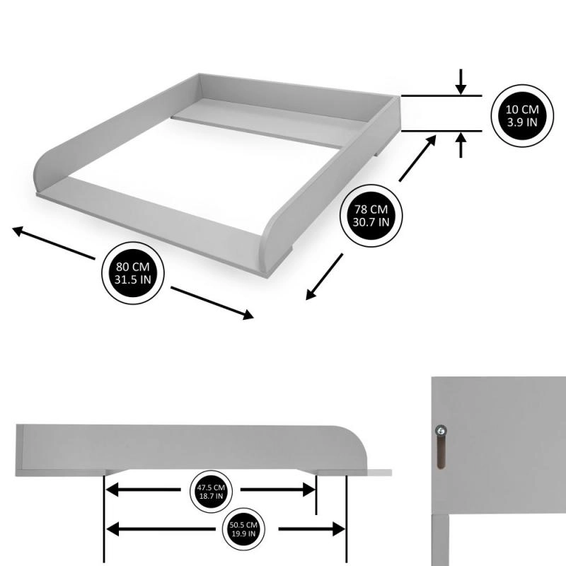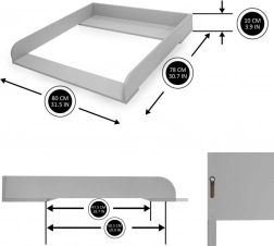 Ten szary drewniany przewijak zamieni Twoją komodę w bezpieczne i ergonomiczne miejsce do codziennej pielęgnacji maluszka. Dzięki przesuwanej przedniej listwie łatwo dopasujesz przewijak – przesunięcie do 4 cm zapewnia lepszy dostęp i komfort podczas przewijania.