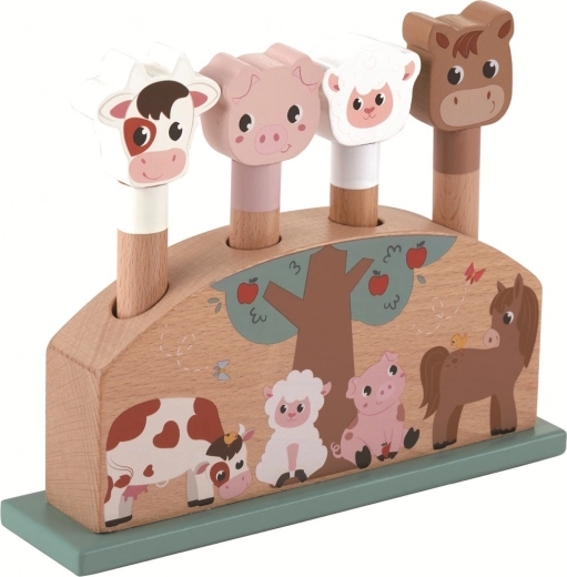 Odkryj zabawną drewnianą zabawkę pop-up z farmowymi zwierzątkami, które po naciśnięciu sprężyny wyskakują z podstawki. Ta zabawka świetnie rozwija małą motorykę, oferuje stabilną podstawę i zachwyca uroczym designem w przyjemnych, naturalnych barwach. Idealny prezent dla dzieci od 1 roku.