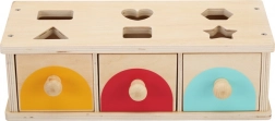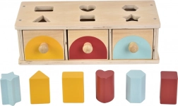 Górna płyta z wycięciami prowadzi dziecko do precyzyjnego wkładania, a trzy szufladki z uchwytami umożliwiają łatwe wyjmowanie elementów i powtarzalną zabawę. Trwałe wykonanie zapewnia długą żywotność i bezpieczną zabawę już od 1. roku życia.