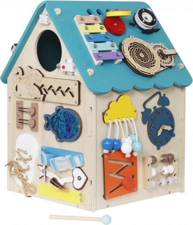 Odkryj magię nauki przez zabawę z tym interaktywnym domkiem montessori w turkusowym kolorze od 2Kids Toys. Oferuje dzieciom bogate aktywności rozwijające motorykę małą, myślenie logiczne oraz koordynację ręka–oko. Znajdziesz tu zamki i zasuwki z tajemnymi drzwiczkami, spinner, obrotowy minutnik, wyłączniki, kolorowy labirynt, ksylofon z pałeczką oraz zegar – wszystko w bezpiecznym, drewnianym wykonaniu.