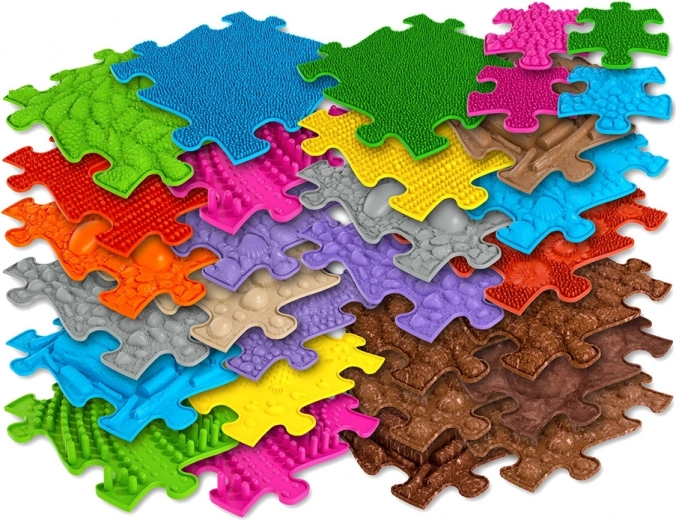 Ortopedyczna sensomotoryczna mata WOOPIE Royal Puzzle została zaprojektowana do codziennej zabawy i ukierunkowanych ćwiczeń. Różnorodne powierzchnie, takie jak „kokos”, „pień”, „orzechy”, „trawa” czy „muszle”, oferują naturalną stymulację receptorów na stopach, wspierają integrację sensoryczną i pomagają zapobiegać płaskostopiu. Elementy składają się jak puzzle, dzięki czemu łatwo ułożysz tor dopasowany do potrzeb.