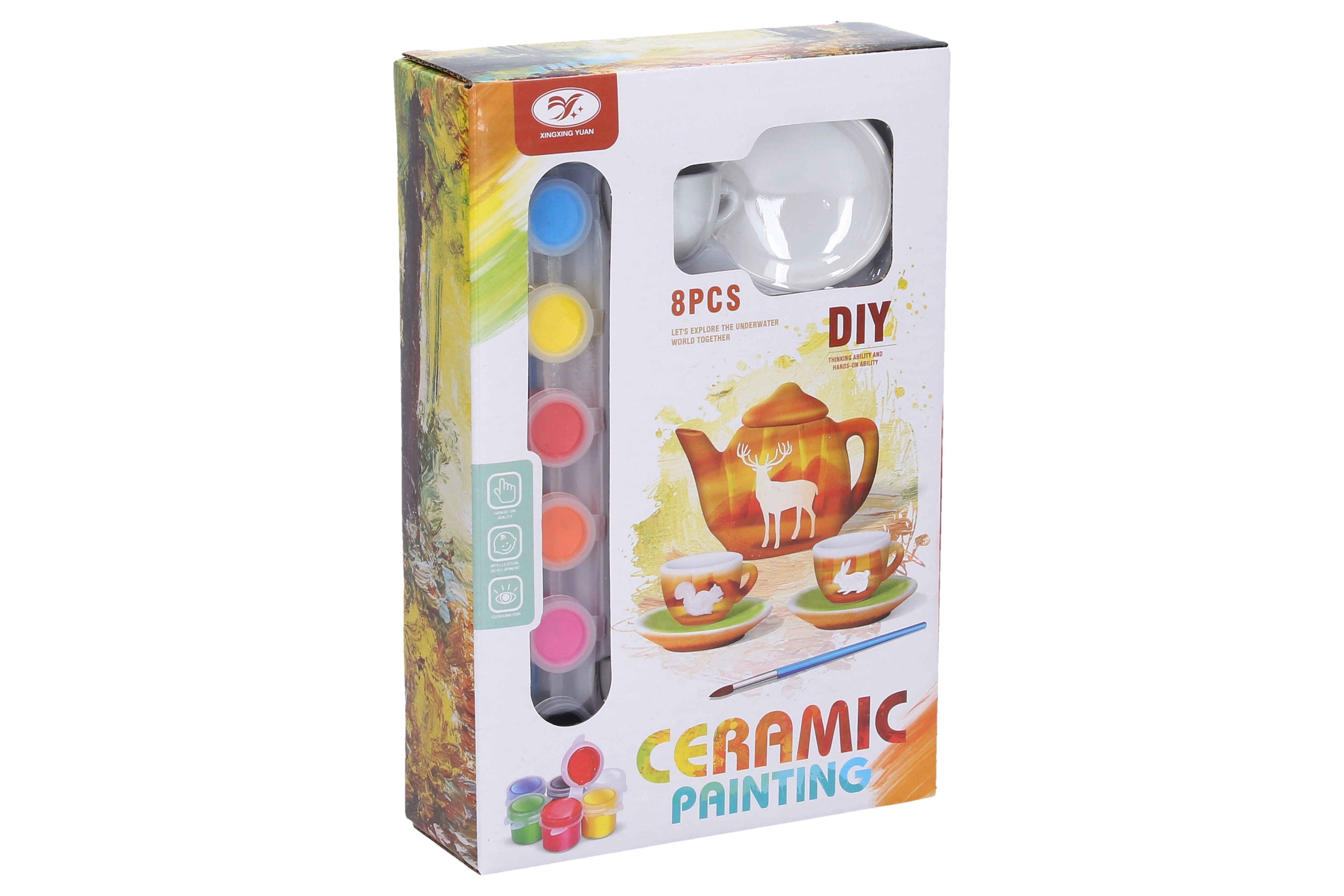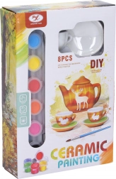 - Kompletny zestaw: dzbanek z pokrywką, 2 kubeczki, 2 spodeczki, 6 farb, pędzelek