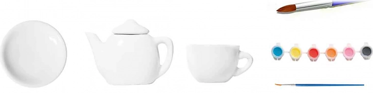 - Dzbanek z pokrywką, 2 kubeczki, 2 spodeczki, zestaw 6 farb, pędzelek