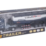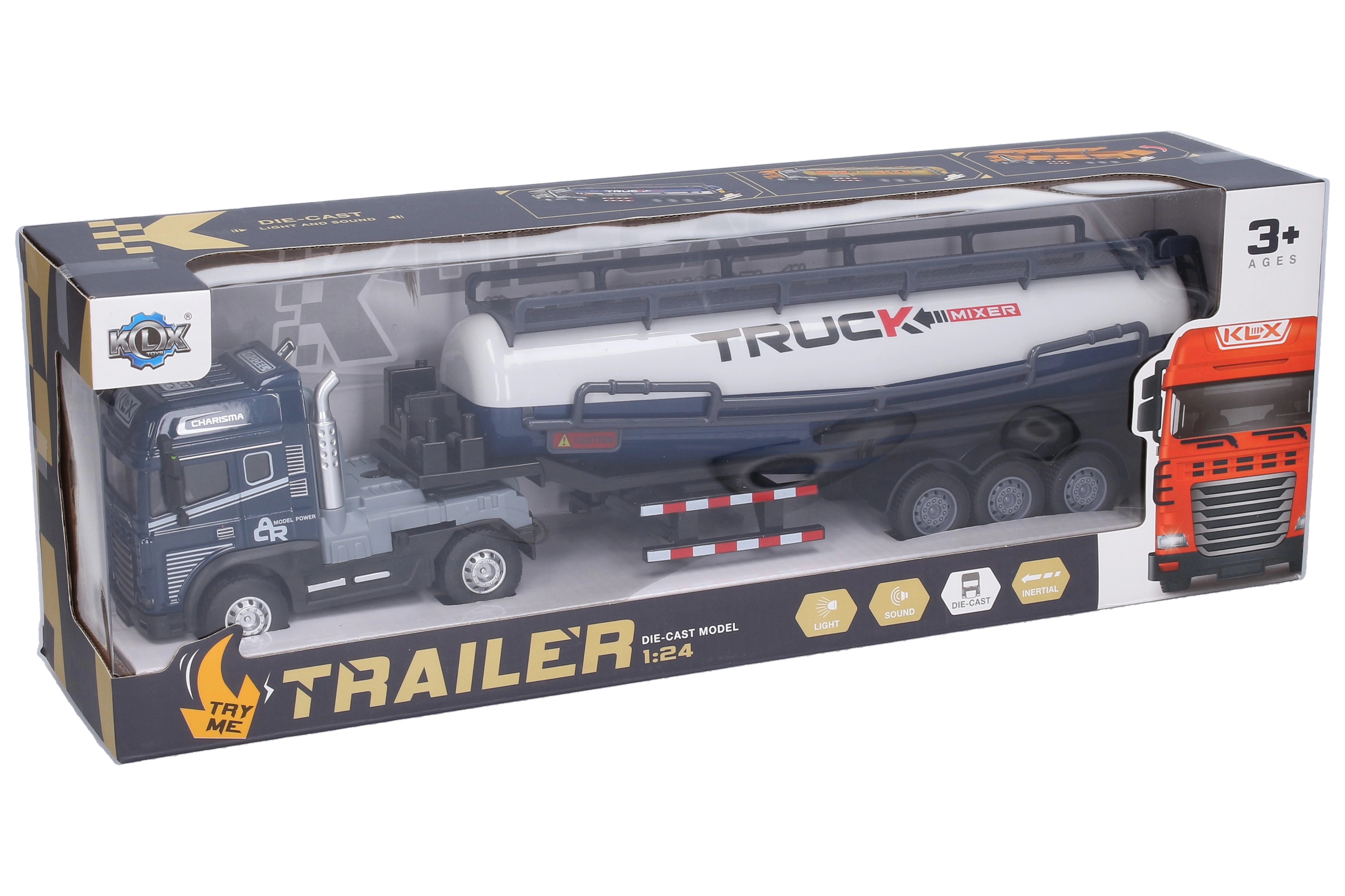 Ciesz się świetną zabawą z detalicznie wykonanym metalowym ciągnikiem siodłowym z cysterną o długości 40 cm. Dzięki napędowi sprężynowemu (friction) rusza do przodu po lekkim popchnięciu, a jego świetlne i dźwiękowe efekty aktywują się automatycznie podczas ruchu przednich kół.