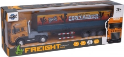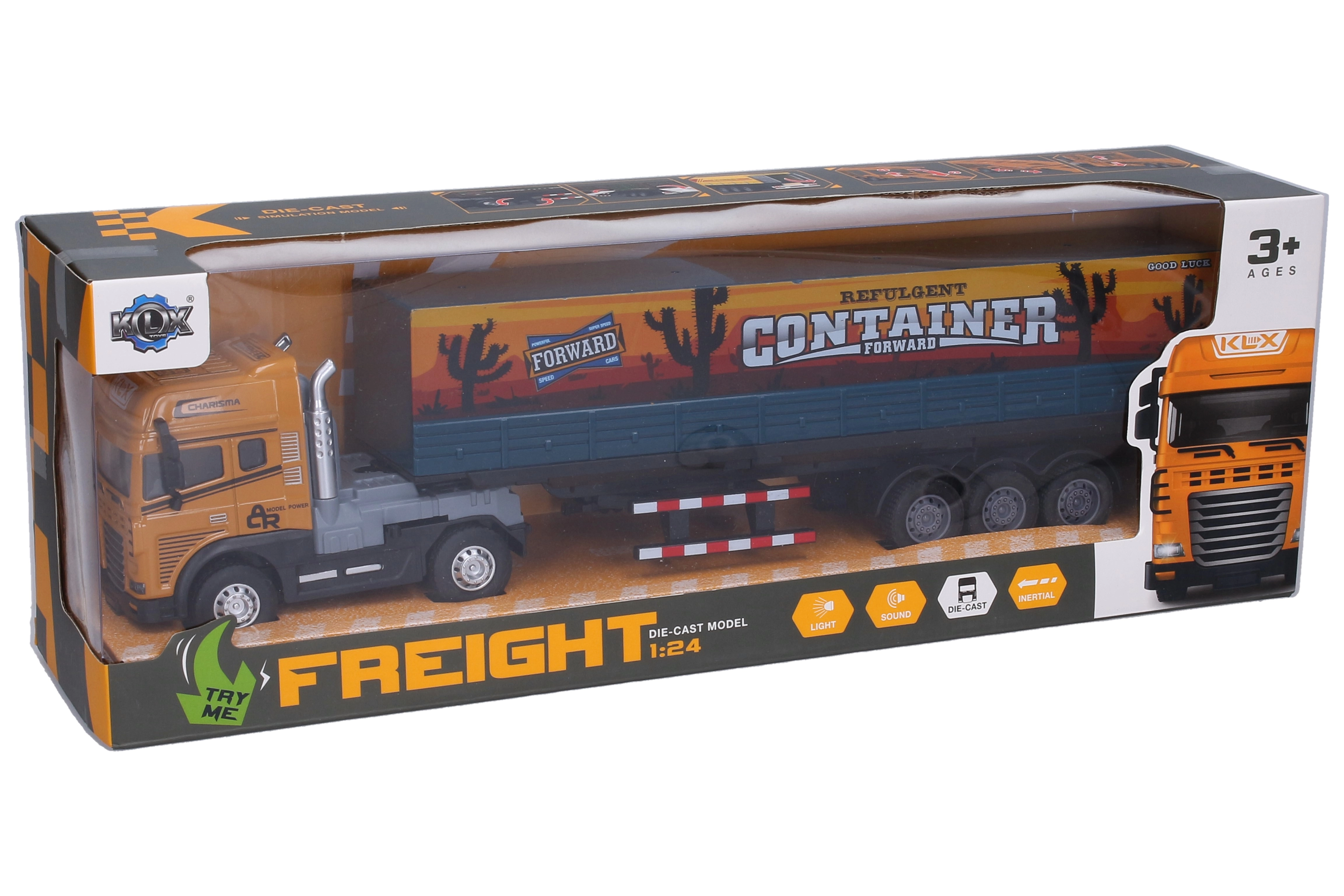 Realistyczny metalowy ciągnik siodłowy z odłączaną naczepą-kontenerem ucieszy małych i dużych kierowców. Oferuje efekty świetlne i dźwiękowe, napęd na sprężynę (friction) dla płynnej jazdy, otwierane drzwiczki kontenera oraz aktywację efektów poruszeniem przednich kół. Długość modelu to 40 cm, baterie 3× AG13 w zestawie.