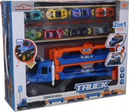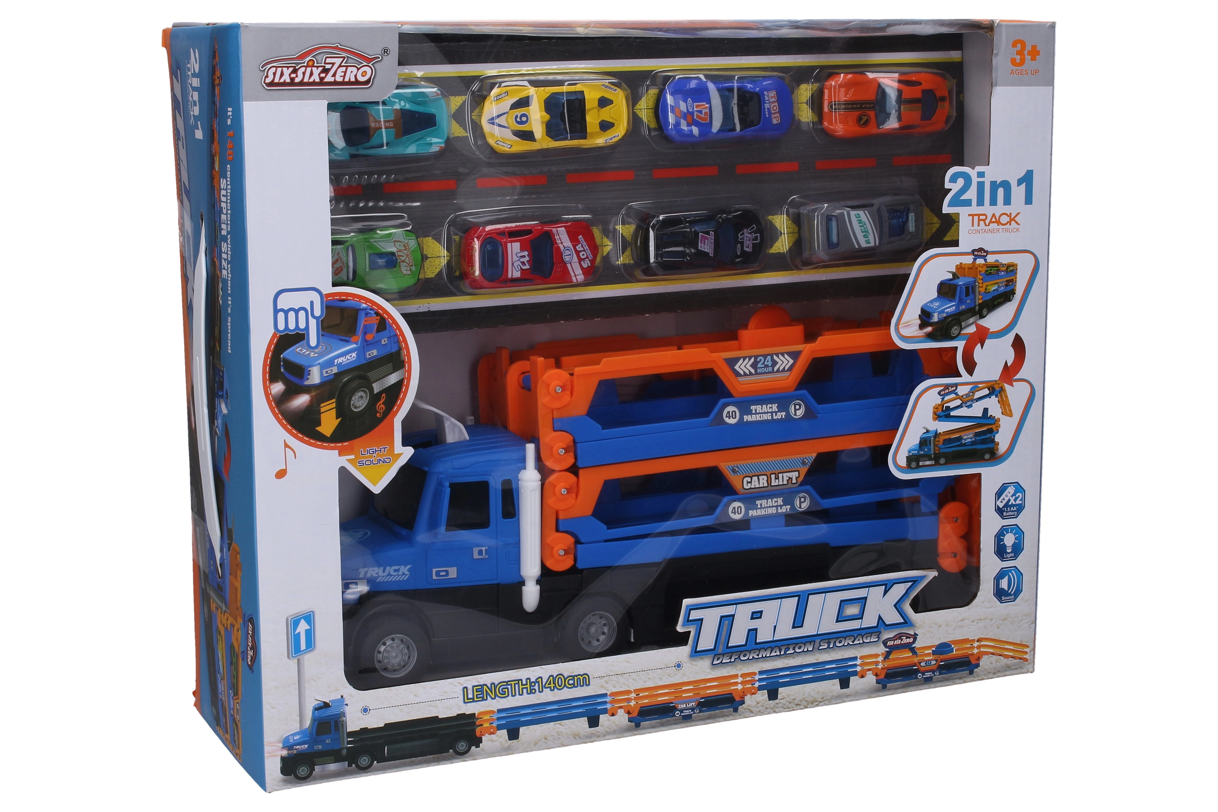 W opakowaniu znajduje się 8 metalowych autek (ok. 6,5 cm) z lekko toczącymi się kołami, więc jesteś gotów do wyścigu od razu po rozpakowaniu. Po złożeniu ciężarówka ma kompaktowe wymiary, co ułatwia przenoszenie i przechowywanie.