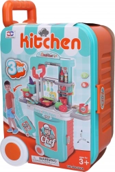 Ta przenośna kuchnia w formie walizki łatwo przekształca się w zestaw do zabawy o wymiarach 66 × 50 × 21 cm. W zestawie znajdują się naczynia, sztućce, produkty spożywcze i inne akcesoria, więc dzieci mogą od razu zacząć „gotować”. Płyta grzewcza po włączeniu świeci i wydaje realistyczne dźwięki, które pobudzają wyobraźnię i zabawę.