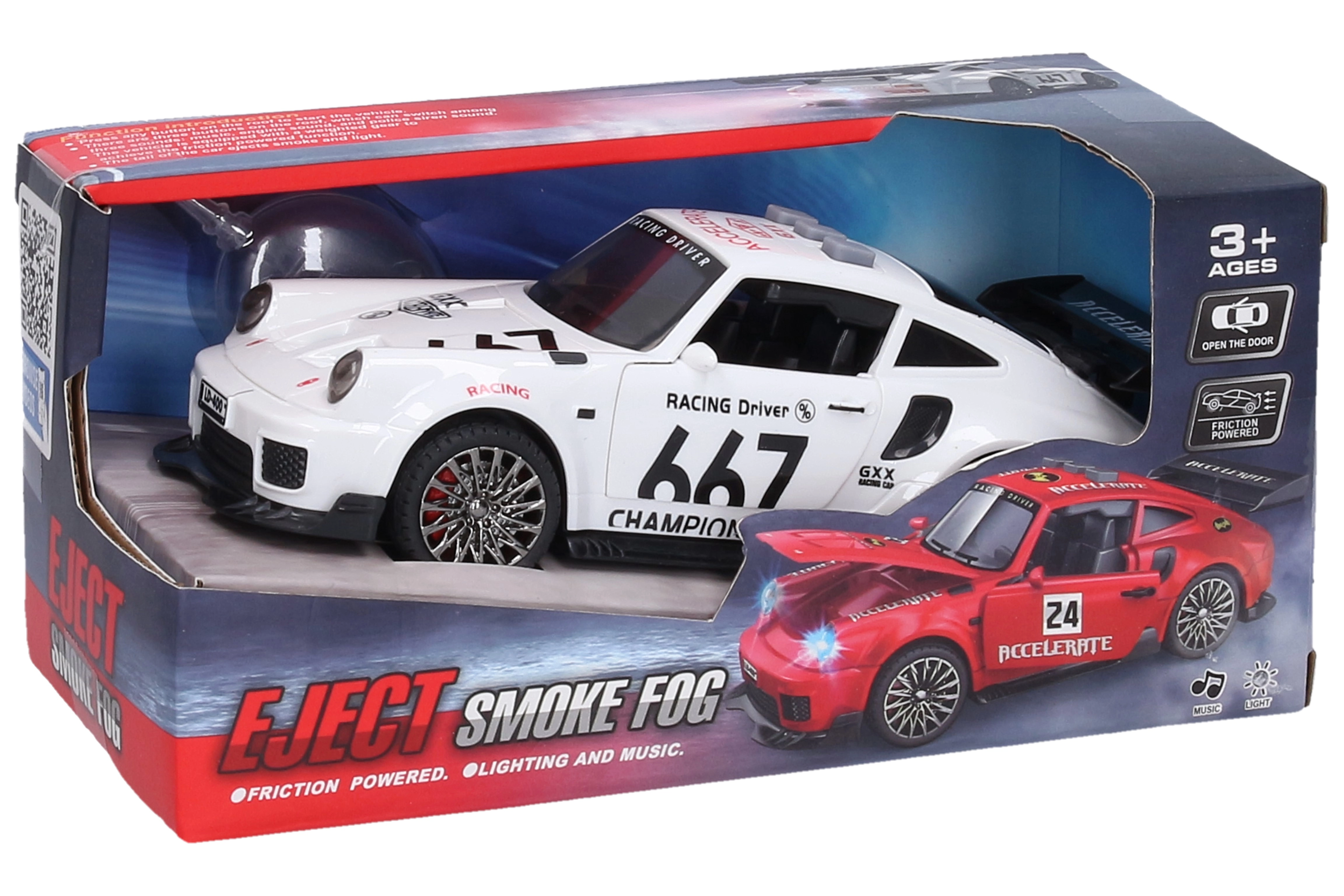 Ciesz się dynamiczną jazdą z tym kompaktowym samochodem wyścigowym o długości 15 cm, oferującym efekty świetlne, dźwiękowe oraz imponujące efekty dymu. Dzięki otwieranej masce i drzwiom oraz aktywacji efektów przyciskami na dachu (dźwięk silnika, syrena, muzyka) to świetny wybór dla małych i dużych fanów szybkich kół.
