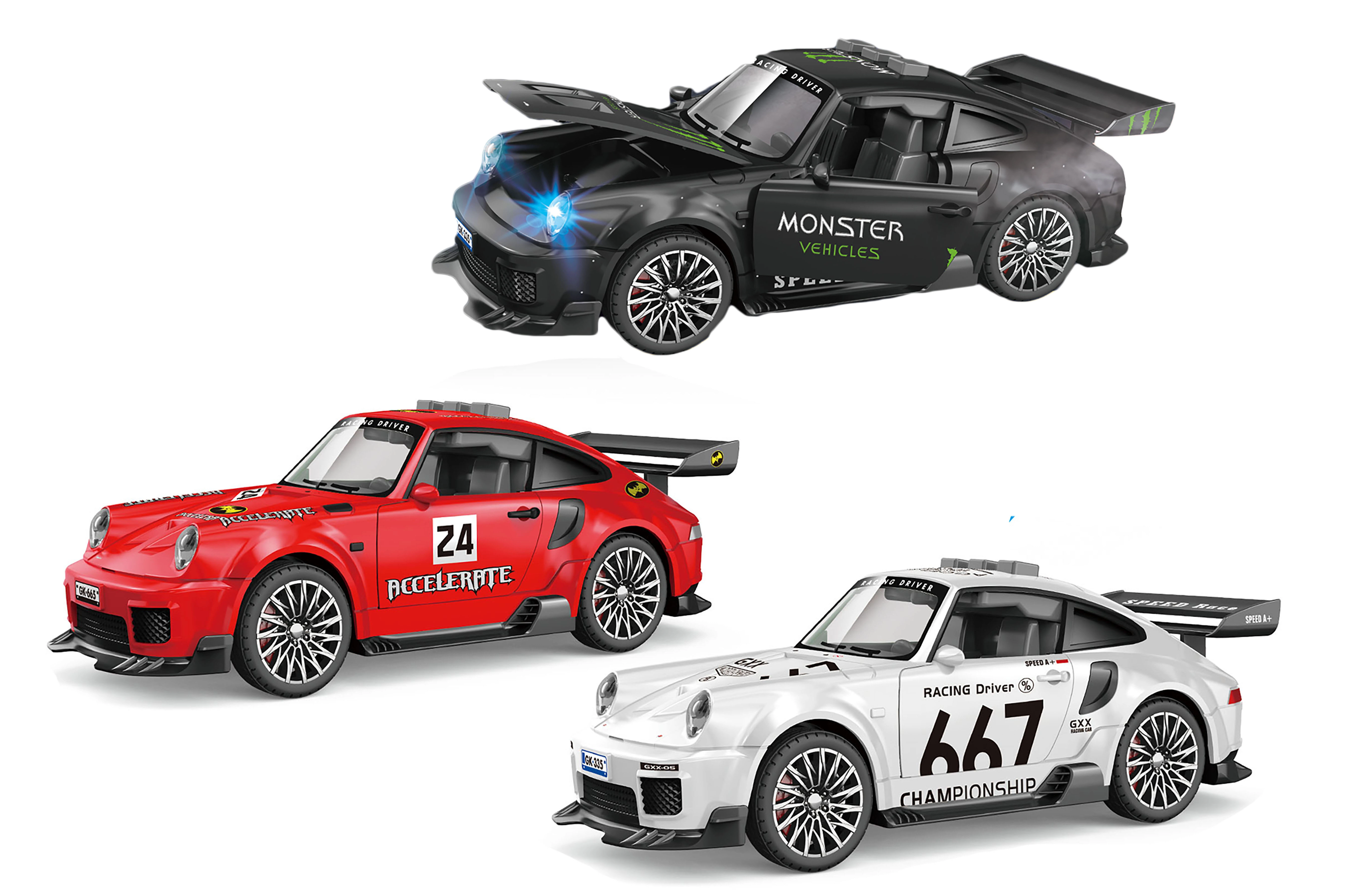 Efekty uruchamiane są łatwo przyciskami na dachu – wybierz dźwięk silnika, dźwięk syreny lub muzykę. Dzięki praktycznemu rozmiarowi auto jest idealne w podróży i do domowych wyścigów. Dostępne w trzech wersjach kolorystycznych: czerwonej, czarnej i białej.