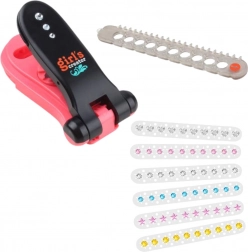 Kreatywny zestaw dla małych elegantek umożliwia szybko i łatwo ozdabiać włosy, paznokcie, skórę oraz przedmioty błyszczącymi kamyczkami. Dzięki praktycznej maszynce wystarczy włożyć taśmę z kryształkami, przyłożyć w wybrane miejsce i jednym naciśnięciem stworzyć natychmiastowy, lśniący efekt. W opakowaniu znajduje się 80 kryształków w różnych kształtach, co pozwala na nieskończone kombinacje.