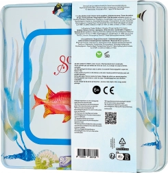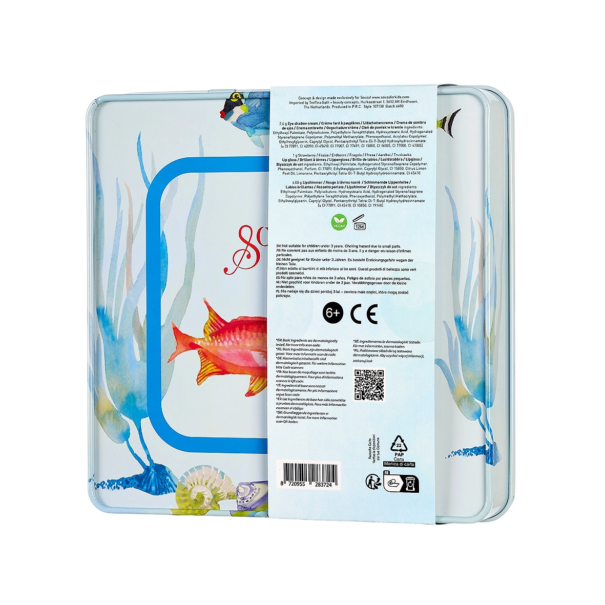 Elegancki dziecięcy zestaw do makijażu w metalowym etui z motywem syrenki ucieszy małe elegantki od 6. roku życia. Zawiera błyszczące cienie do powiek (różowy, złoty, niebieski), 6 kremowych pomadek w odcieniach różu oraz płynny błyszczyk o truskawkowym smaku. W zestawie znajduje się podwójny aplikator. Kosmetyki są przebadane dermatologicznie, łatwo zmywalne, w 100% wegańskie i nietestowane na zwierzętach.