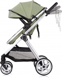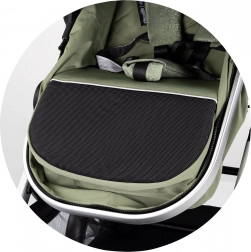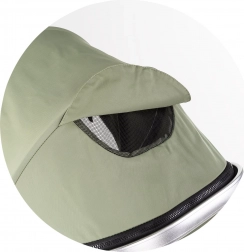 Regulowana budka z przeciwsłonecznym daszkiem i okienkiem, wysoko regulowana rączka z eko‑skóry, duży kosz, pokrowiec na nóżki oraz pasek bezpieczeństwa na rączce.
