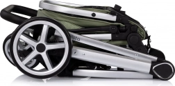 Lekki aluminiowy stelaż z amortyzacją wszystkich kół, połączony hamulec tylny oraz 5‑punktowe pasy z miękkimi osłonkami zapewniają spokój i bezpieczeństwo w każdej podróży.
