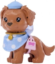 Kropkowana sukienka, beret i akcesoria lalki są zgrane z uroczym pieskiem, tworząc idealny modowy duet.