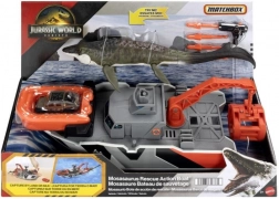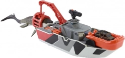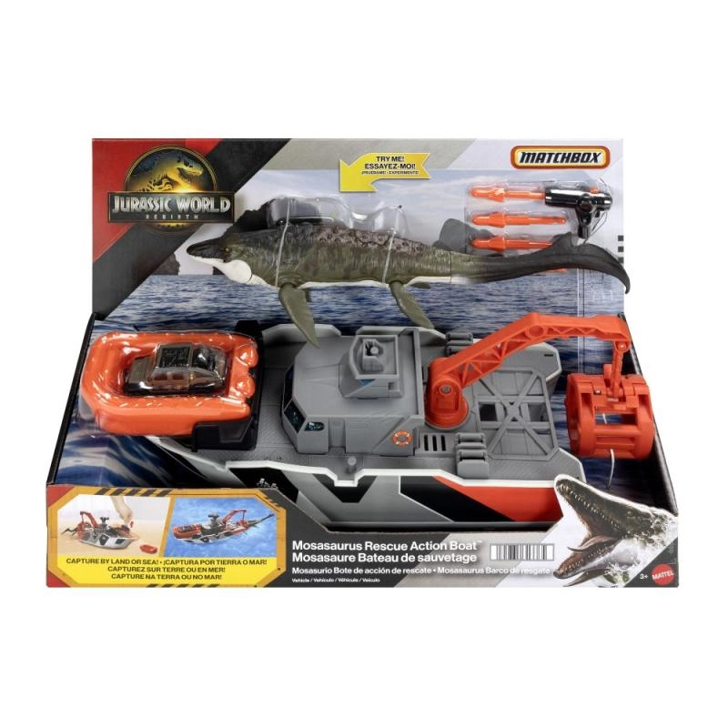 W zestawie znajduje się duży mozazaur z ruchomą szczęką, zachęcający do dramatycznych scen odłowu. Wyrzutnie harpunów i działająca wyciągarka dodają każdej misji napięcia – zdobądź próbki DNA i bezpiecznie dostarcz je na pokład. Odłączana łódź ratunkowa oraz dołączony Jeep w skali 1:64 poszerzają możliwości zabawy i wspierają kreatywne opowiadanie historii.