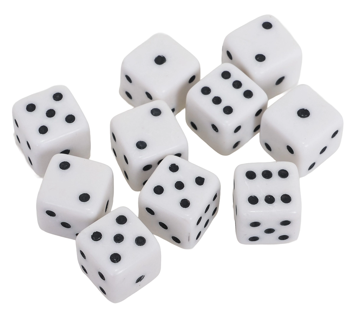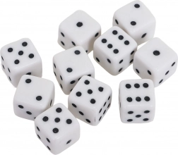 Zestaw zawiera 10 białych kości z czarnymi kropkami dla wyraźnej czytelności i uniwersalnego zastosowania.