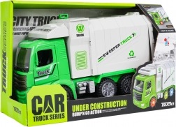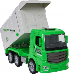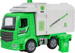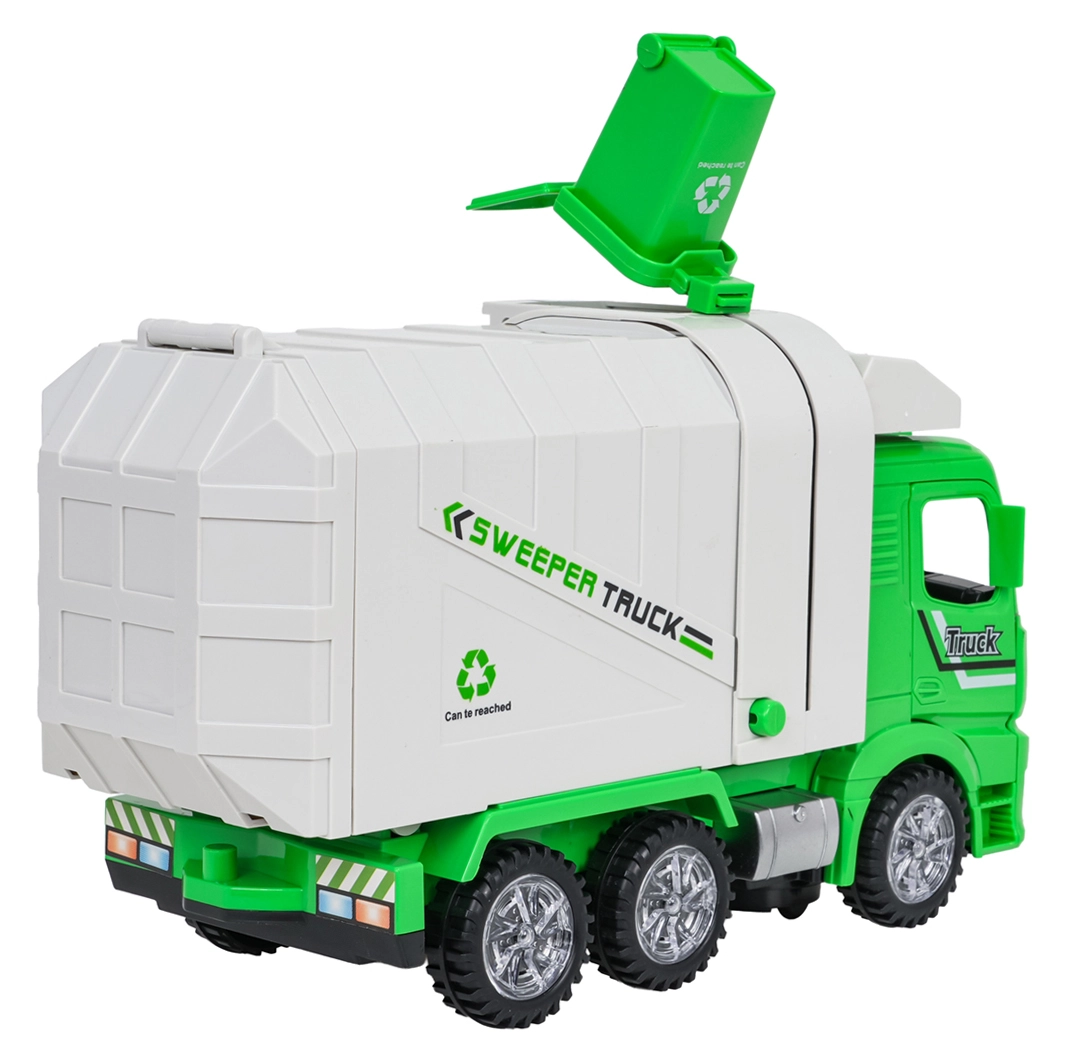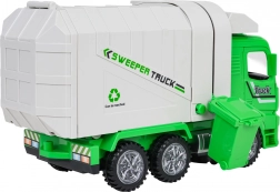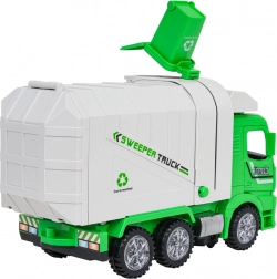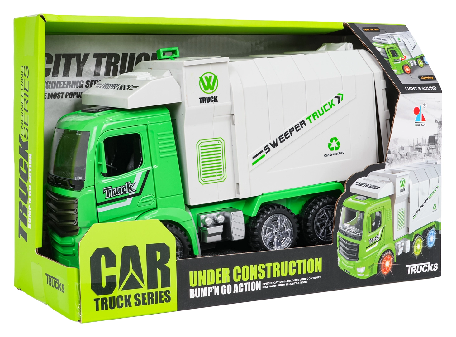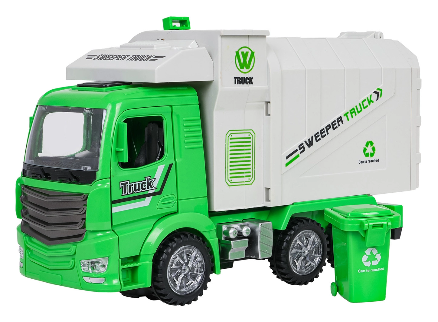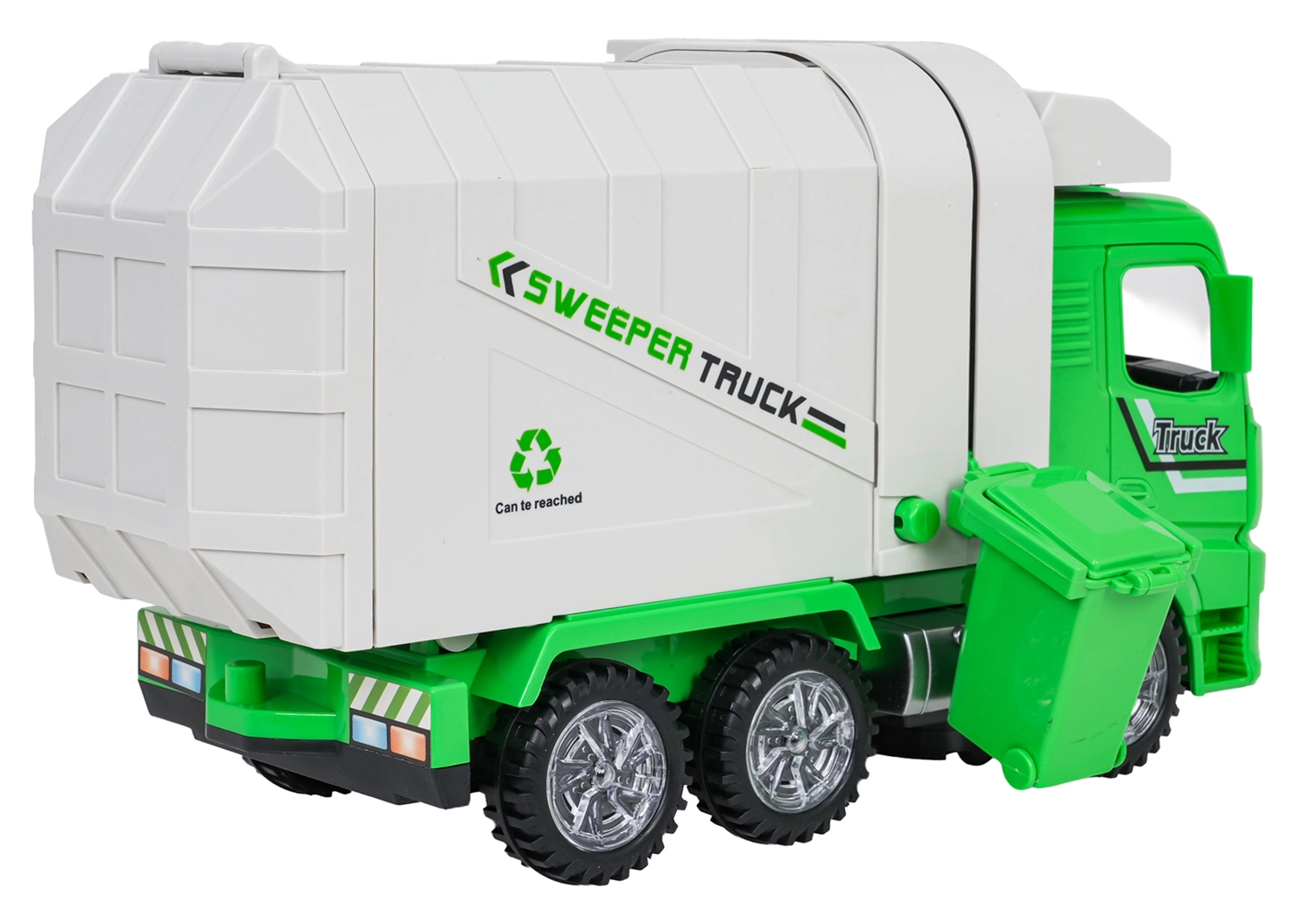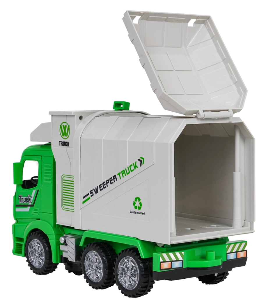 Interaktywna śmieciarka z wysokiej jakości plastiku ucieszy wszystkich małych miłośników techniki. Pojazd potrafi poruszać się we wszystkich kierunkach dzięki dolnemu obrotowemu kółku, podczas jazdy świecą przednie światła oraz podświetlane koła. Drzwi kabiny się otwierają, kontener można podnosić i opuszczać, a także otworzyć jego tylne wieko.