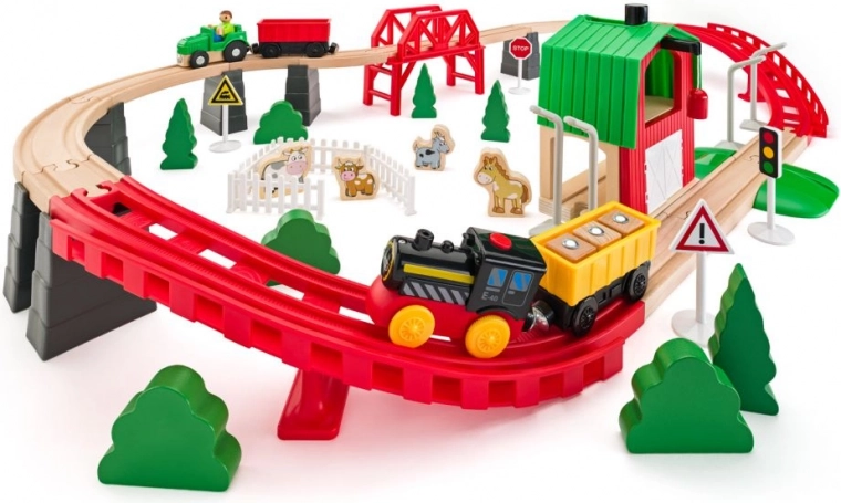 Drewniana kolejka Życie na farmie przenosi dzieci w autentyczny świat farmy z pociągiem, torami i tematycznymi akcesoriami. Dzieci mogą tworzyć własne historie, rozwijać koordynację ręka–oko oraz poznawać podstawowe zasady przyczyna–skutek podczas przesuwania pociągu po torach.