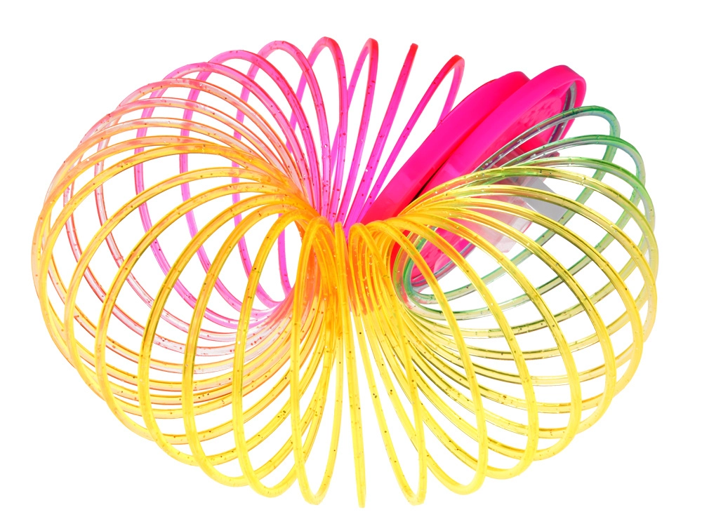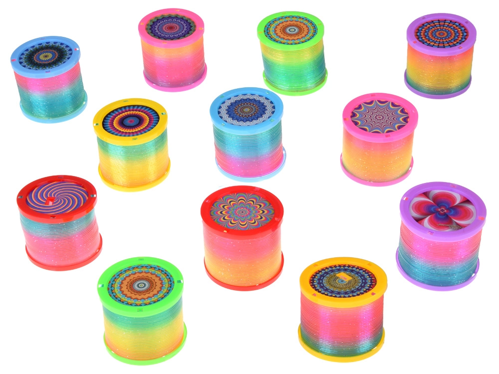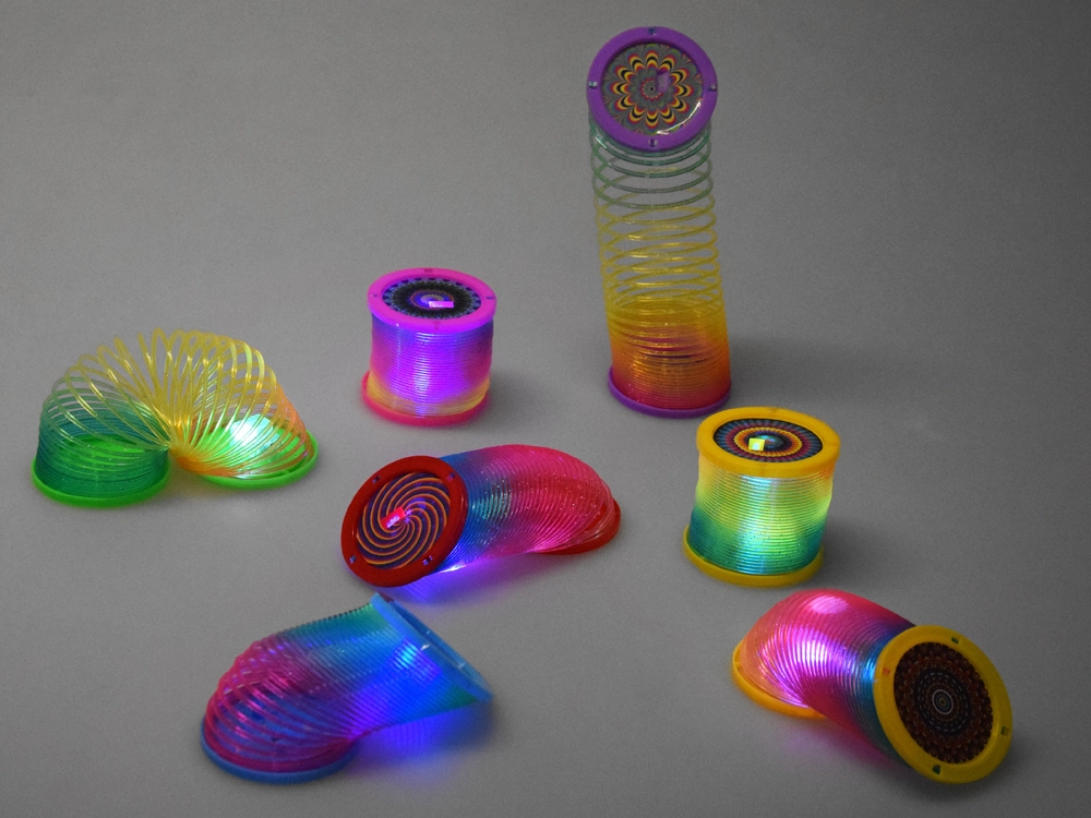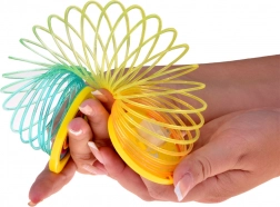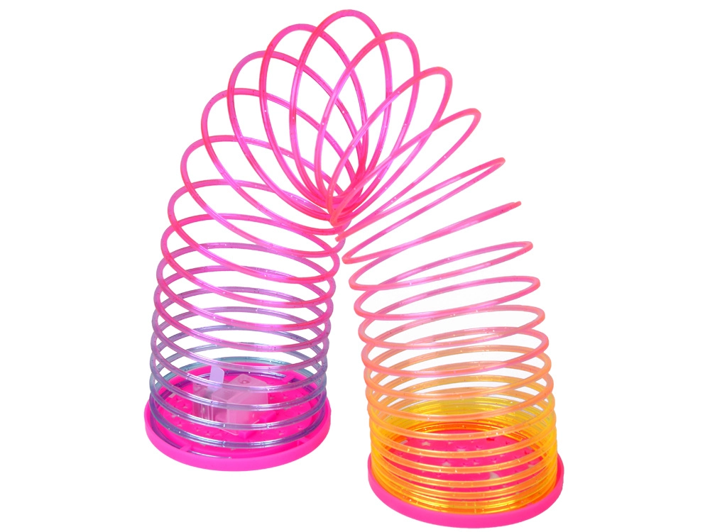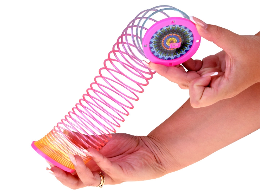 Popularna tęczowa sprężynka wraca w świecącej wersji, która zachwyci dzieci i dorosłych. Po aktywacji diod LED zmienia kolory w różnych rytmach, a po zdjęciu osłonnej naklejki zamienia się w projektor gwiazd – wyczaruje na ścianie kolorowe gwiazdy i księżyc. Świetna do zabawy na schodach, prostych trików i relaksu.