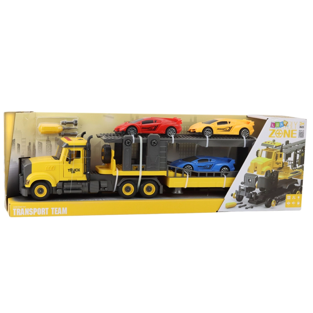 Odkryj wielofunkcyjną zabawkę, która łączy zabawę konstrukcyjną z drogową przygodą. Duża laweta przewozi trzy sportowe auta, które można wyjąć i bawić się nimi oddzielnie. Zintegrowane efekty świetlne i dźwiękowe dodają rozgrywce autentyczności, a dołączony śrubokręt z 3 wymiennymi końcówkami pozwala dzieciom rozmontować i ponownie złożyć wybrane części pojazdu.