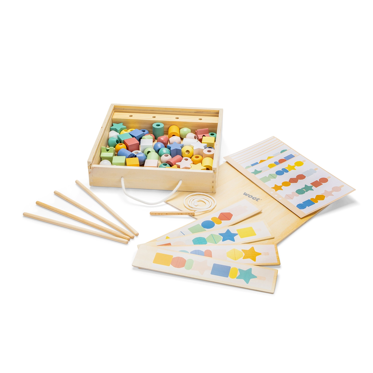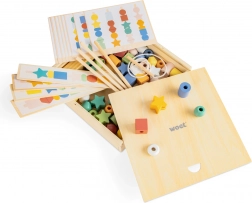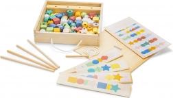 - Drewniane pudełko z wieczkiem, 56 kolorowych koralików, 8 dwustronnych kart ze wzorami, 4 stojaki do sortowania z kartami, sznurek do nawlekania
