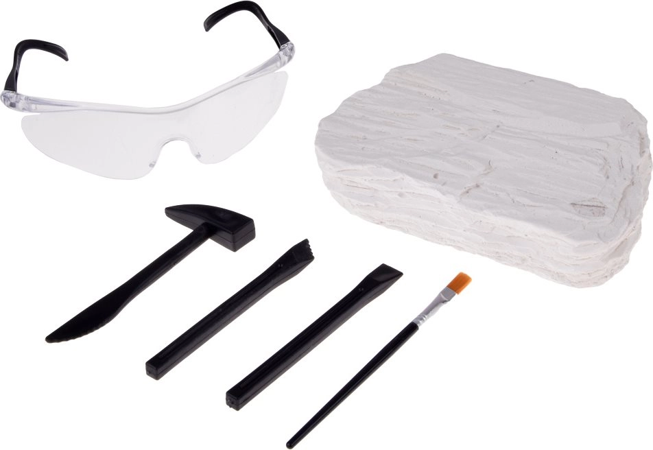 W zestawie znajduje się solidny gipsowy blok oraz okulary ochronne, które chronią oczy podczas odkrywania skamieniałości. Idealny do bezpiecznej domowej archeologii.