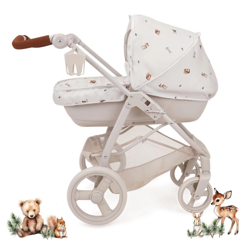 Stylowy wózek dla lalek 2w1 Bella w wzorze Woodland zachwyci małe opiekunki przemyślanym wykonaniem. Oferuje połączenie gondoli i wersji spacerowej, ma regulowaną rączkę, obrotowe przednie koło dla łatwego manewrowania, duży kosz oraz praktyczną torbę na akcesoria. Dzięki odpinanej gondoli, budce i osłonce na nóżki idealnie nadaje się do zabawy w domu i na zewnątrz.