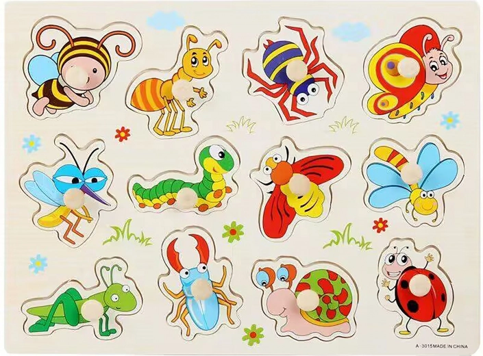 Ta wysokiej jakości drewniana układanka z kolorowymi motywami owadów jest idealna do pierwszego poznawania świata zwierząt przez dzieci. Elementy łatwo się chwytają i dokładnie pasują do przygotowanych otworów, co wspiera koordynację ręka–oko oraz cierpliwość.