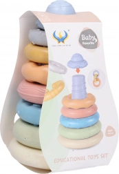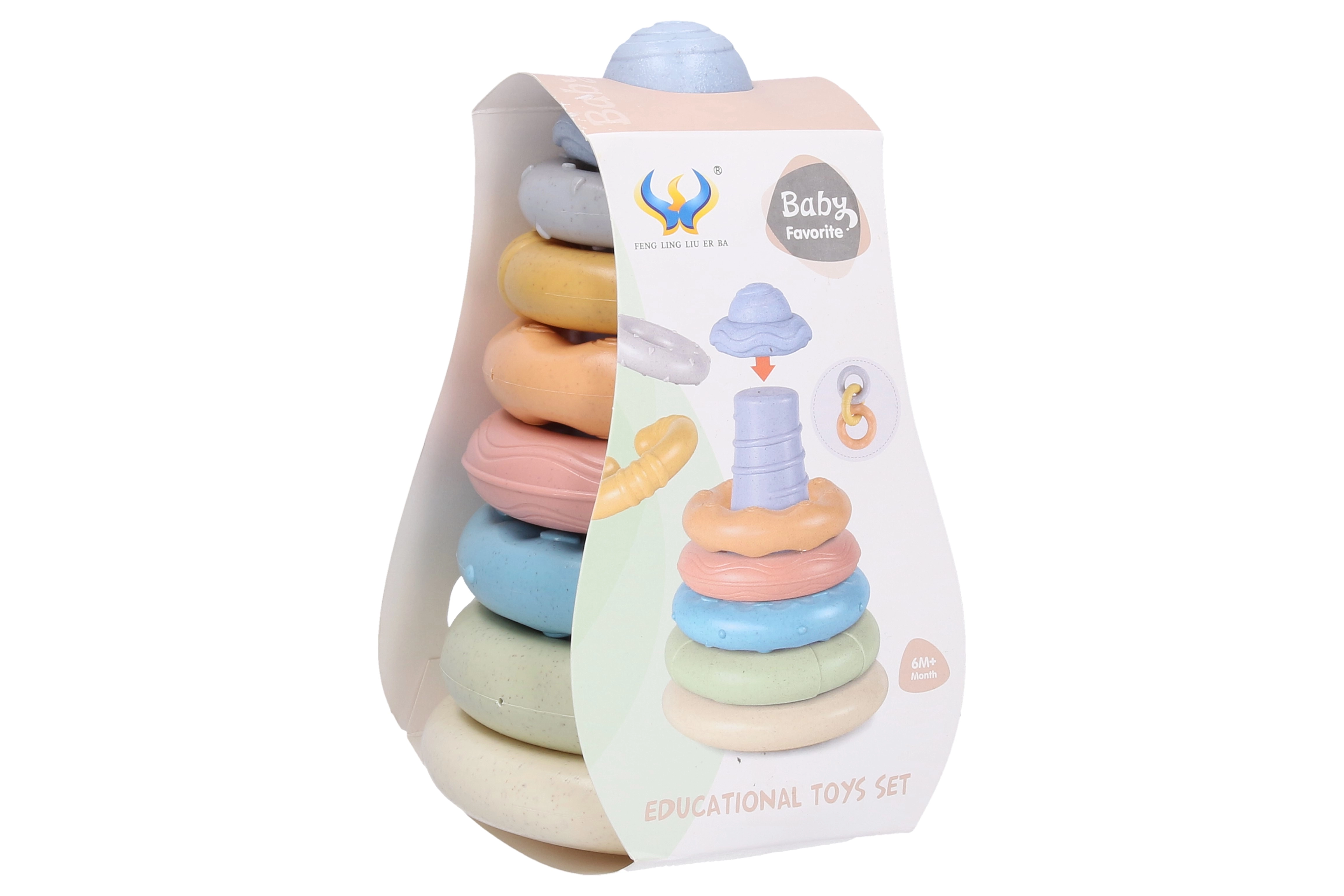 Ta klasyczna zabawka edukacyjna wspiera prawidłowy rozwój dziecka w formie zabawy. Dzięki różnym rozmiarom kółek dzieci uczą się rozpoznawania kolejności, kolorów oraz trenują chwyt. Wieża jest lekka, wytrzymała i idealna do codziennej zabawy w domu i w podróży.