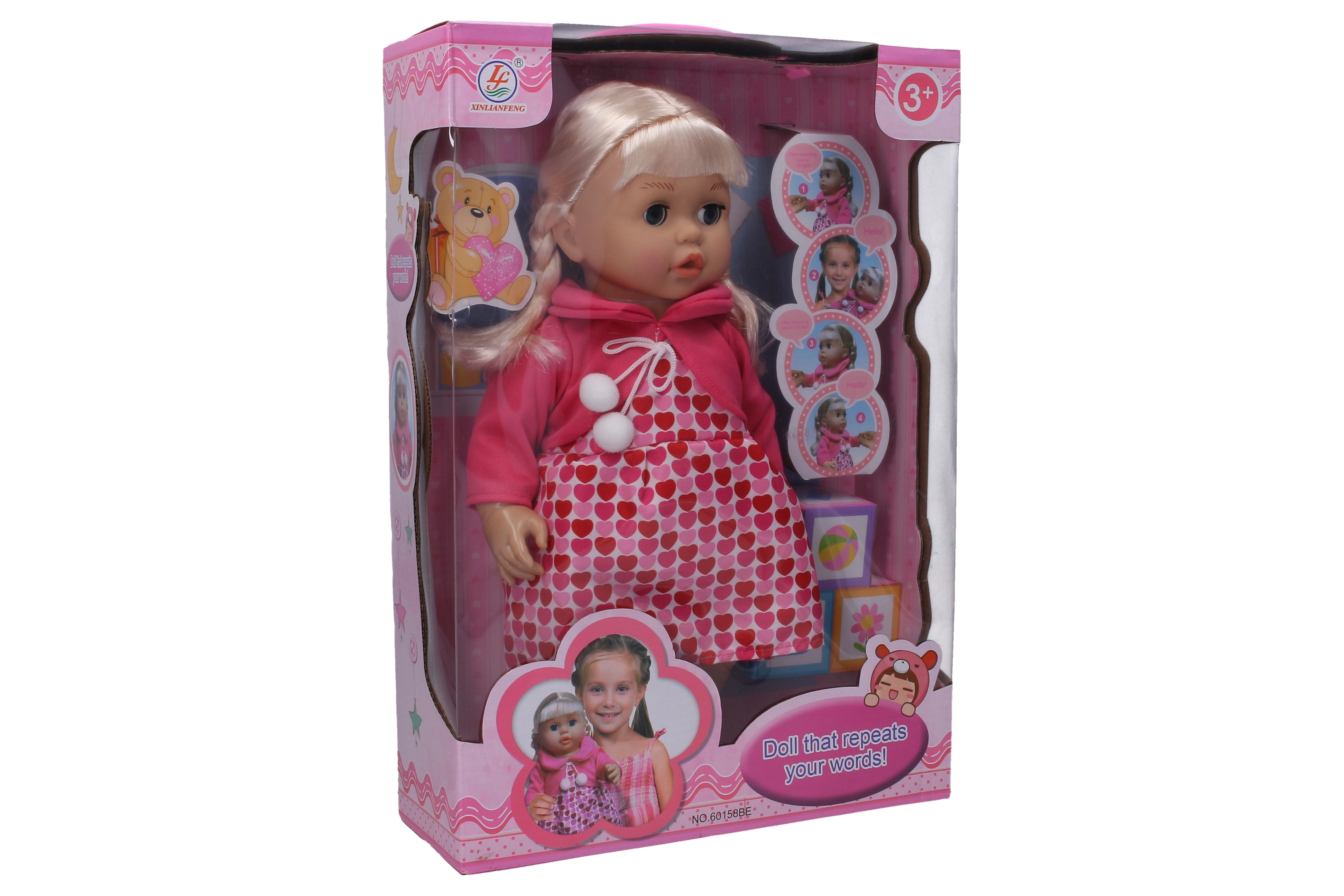 Zabawna lalka, która powtarza to, co powiesz! Po naciśnięciu prawej ręki rozpoczyna się nagrywanie, a po naciśnięciu lewej ręki lalka odtwarza Twoją wiadomość. Wysokość 40 cm. Interaktywna zabawka wspierająca rozwój mowy i zapewniająca świetną zabawę. Łatwa obsługa za pomocą przycisków w dłoniach. Baterie 2× AA nie są dołączone.
