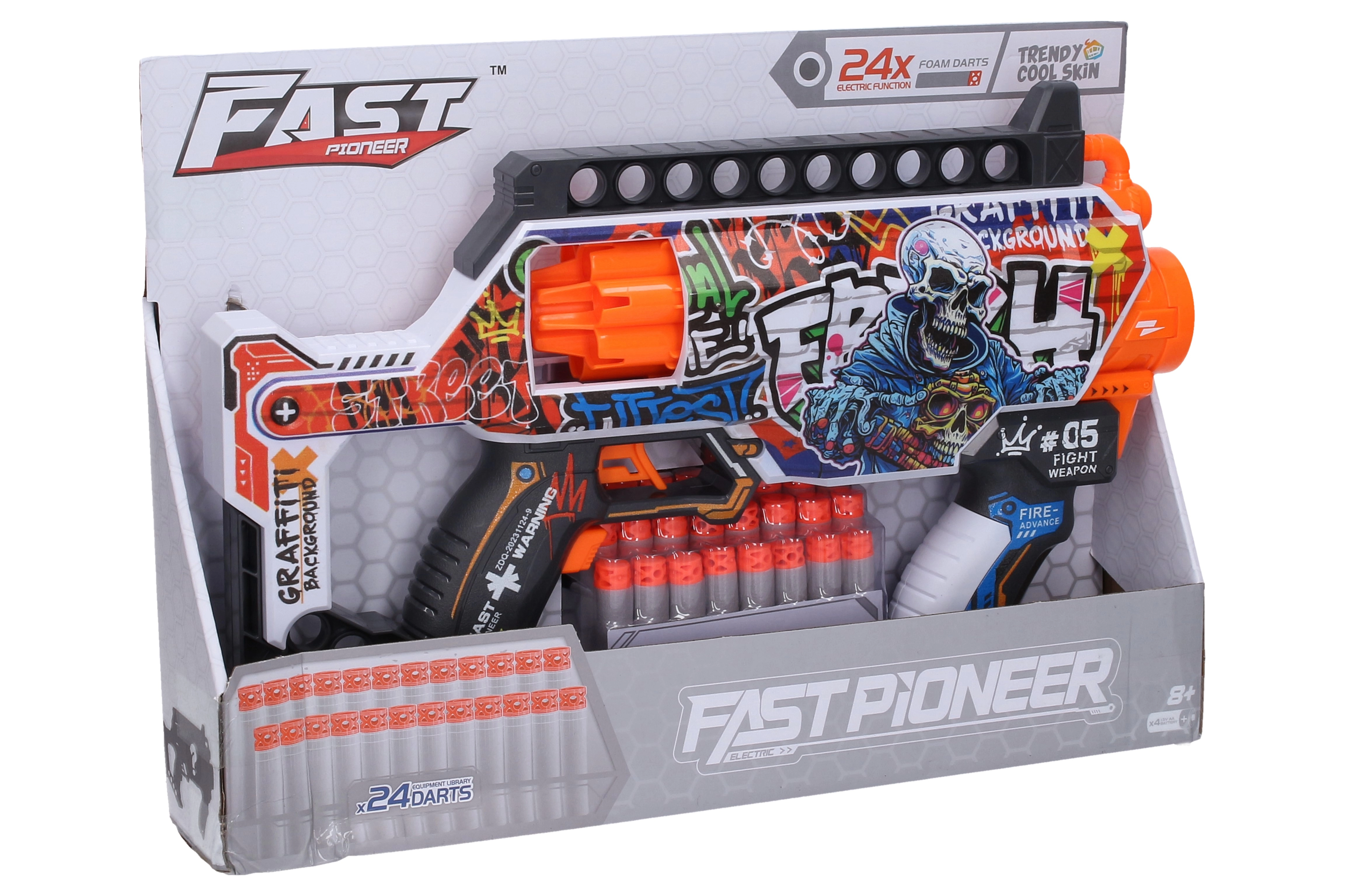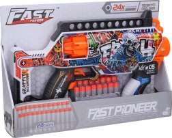 Zabawna dziecięca zabawka do dynamicznych gier – karabin na piankowe naboje w stylu rewolweru o długości 35 cm. Oferuje szybkie strzelanie, bezpieczne miękkie naboje i proste zasilanie na baterie 4× AA (nie są dołączone). W zestawie znajduje się 24 piankowe naboje dla długiej zabawy w domu i na zewnątrz.