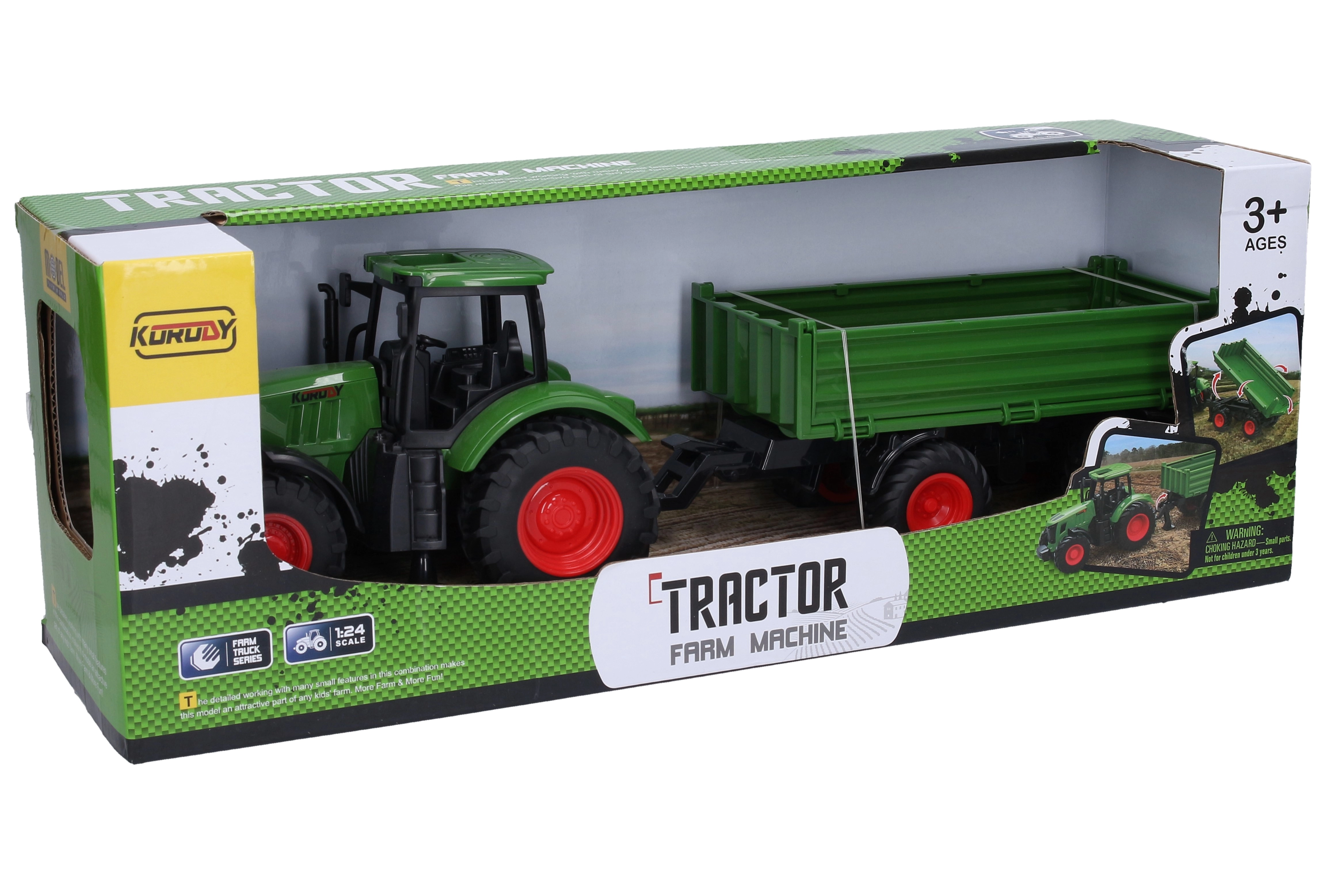 Solidny traktor z przyczepą dla małych farmerów oferuje koła wolnobieżne dla płynnej jazdy, uchylne drzwiczki przyczepy dla łatwego załadunku oraz wymiary 42 × 10,5 × 13 cm, które świetnie sprawdzą się do zabawy w domu i na zewnątrz.